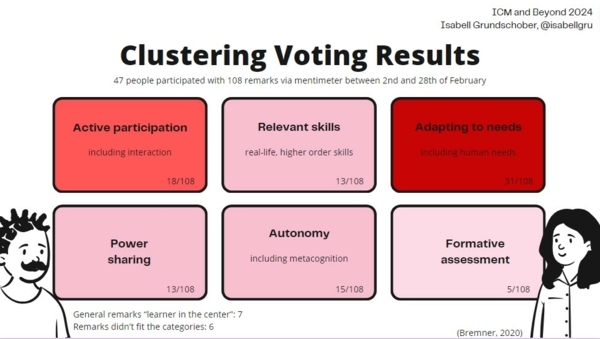 Mich interessierte in weiterer Folge, welche Aspekte die Teilnehmenden der ICM and Beyond 2024 mit „Lernendenzentrierung“ verbinden. Im Voting auf Mentimeter konnte Teilnehmende im Februar 2024 ihre Assoziationen angeben. Am häufigsten genannt wurden Anpassung an die Bedürfnisse der Lernenden mit 31 von 108 Nennungen, gefolgt von aktiver Partizipation mit 18 von 108 Nennungen. Am seltensten genannt wurde, genauso wie im internationalen Vergleich, formatives Feedback. Hier ist eine Übersicht der Voting-Ergebnisse: